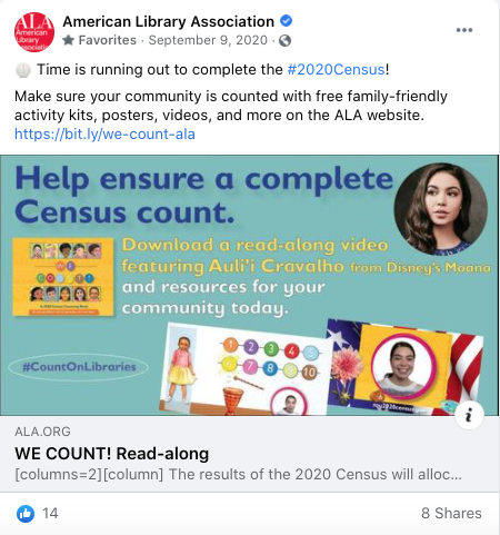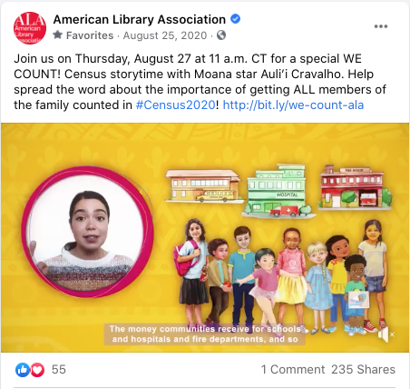 Near the end of the 2020 Census, we teamed up with a publisher on a #CountOnLibraries toolkit/resources and read-along video premiere on Facebook. I created a content schedule, video premiere launch management & wrote content. The video was shared by over 400 libraries who used it as a storytime resource for their Facebook pages. (Click to view full post copy.)